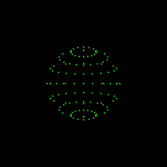 Ändern wir die z-Koordinate des Mittelpunkts auf -1, ergibt sich Abb. 4. Wir stehen mit unserer Kamera in der Mitte der Kugel und können die Hälfte der Punkte hinter uns nicht sehen.