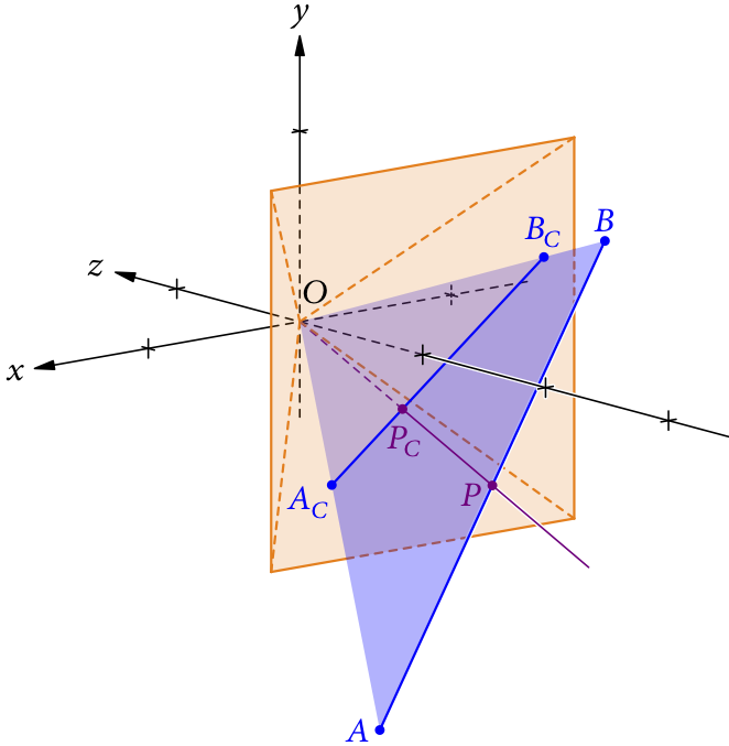 In Abb. 2 haben wir eine Linie AB im Raum vor dem Schirm unserer Standardkamera (s. Teil RS1). Die Endpunkte A und B bilden mit dem Augpunkt O das blaue Dreieck. Dieses Dreieck und unsere orangene Schirmebene schneiden einander in der Linie . Wenn A, B und O nicht auf einer Geraden liegen (nicht kollinear sind), wird die Linie AB immer auf eine Linie projiziert (ansonsten auf einen Punkt).