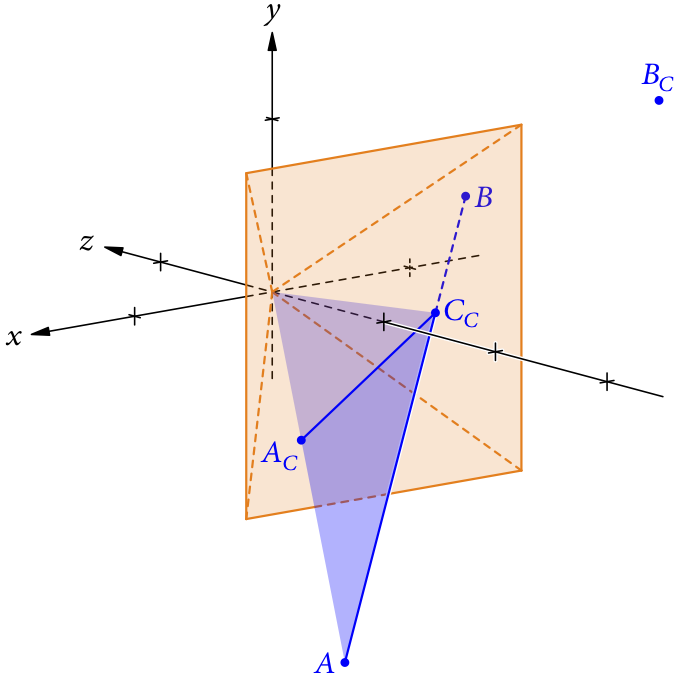 . Weil der Projektionsstrahl von P in der Ebene des blauen Dreiecks liegt, muss