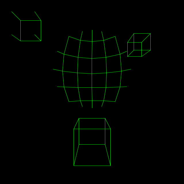 Der gesamte Code findet sich hier. Im Hauptprogramm habe ich den Würfel c2 (links oben) und die Kugel s auf der z-Achse etwas nach vorne geschoben. Das Ergebnis ohne Clipping zeigt Abb. 4. Weil die Kugel näher an den Augpunkt gerückt ist, erscheint sie viel größer und verzerrt, obwohl ihr Radius nicht geändert wurde.