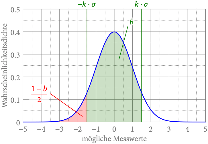 Weil wir jetzt tatsächlich unsere Wahrscheinlichkeitsdichte kennen, können wir sofort die maximale Abweichung für den Bruchteil b berechnen. In Abb. 6 ist die grün schattierte Fläche jener Bruchteil b der Messwerte, die maximal in beide Richtungen abweichen. (Für eine Verteilung übernimmt