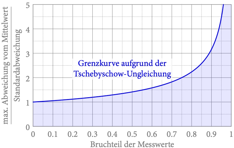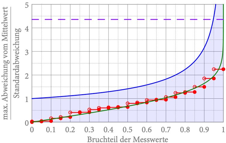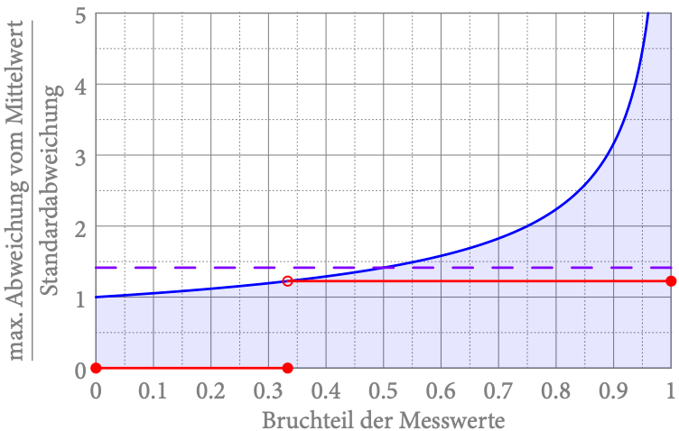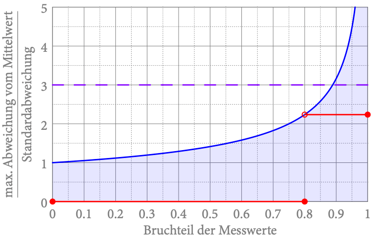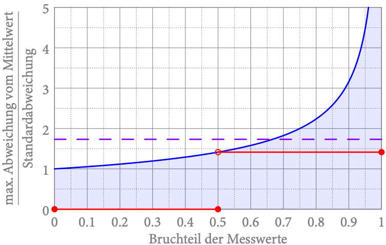 Wie wir oben gesehen haben, brauchen wir für eine große Abweichung nahe dem Bruchteil 1 viele Werte, die nahe beim Mittelwert liegen, um die Standardabweichung klein zu halten, und ein paar, die weiter weg liegen. Insgesamt geht also auch die Anzahl n der Messwerte gegen Unendlich, wodurch sich der Widerspruch auflöst.