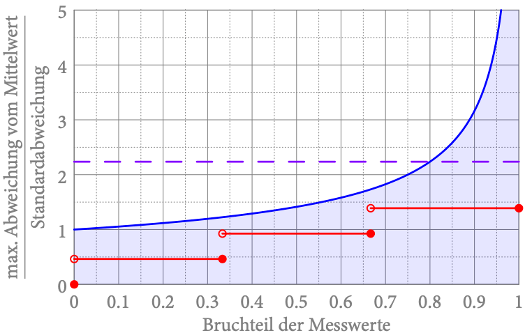 Ein Drittel der Messwerte hat also maximalen Abstand 0, die zwei anderen Drittel haben maximalen Abstand . Diese Anteile sind durch die zwei Geradenstücke in Abb. 2 dargestellt. Prinzipiell kann man diese Geradenstücke auch als stückweise konstante Funktion auffassen. Solange der Bruchteil kleiner gleich 1/3 ist, ist die maximale Abweichung 0; wenn der Bruchteil größer als 1/3 ist, dann ist die maximale Abweichung