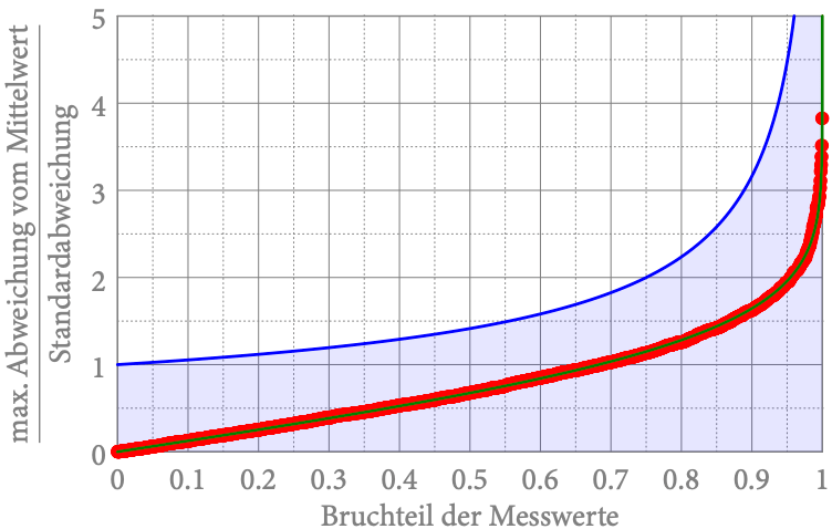 Abb. 1 zeigt das Resultat. Die blaue Kurve ist die maximale Abweichung aus der Tschebyschow-Ungleichung. Die Abweichungen beliebiger Messungen können nicht größer sein, wir sind also sicher irgendwo in der blau schattierten Fläche.