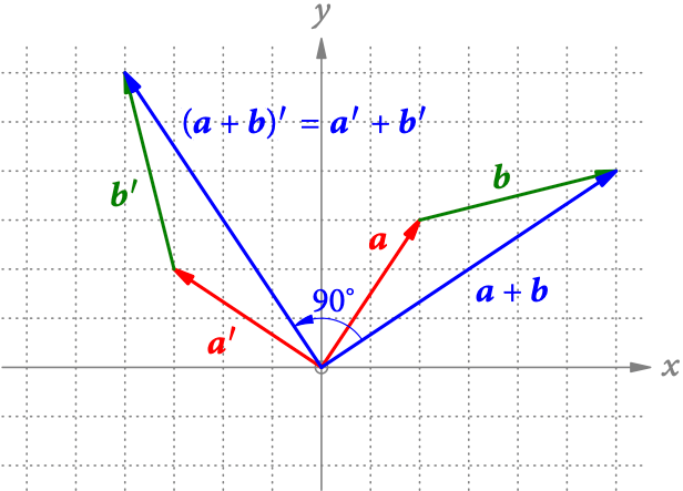 Wie Abb. 4 an einem Beispiel zeigt, ist es auch egal, ob wir zwei Vektoren zuerst addieren und dann ihre Summe 90° drehen, oder ob wir zuerst beide drehen und dann addieren. Damit Abb. 4 nicht zu überladen ist, habe ich die Vektoren und