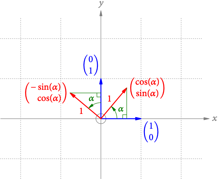 Die gedrehten Basisvektoren in Abb. 7 haben weiterhin die Länge 1. Ihre x– und y-Komponenten bekommen wir über die Winkelfunktionen in den grünen rechtwinkeligen Dreiecken: