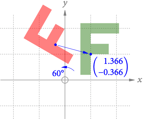 Das grüne F soll jetzt 60° um den Punkt (1|1) gedreht werden. Dazu müssen wir alle Punkte zuerst um (-1|-1) verschieben, dann um den Ursprung drehen und schließlich wieder zurückschieben. Mit der Matrizenmultiplikation erhalten wir die Transformationsmatrix