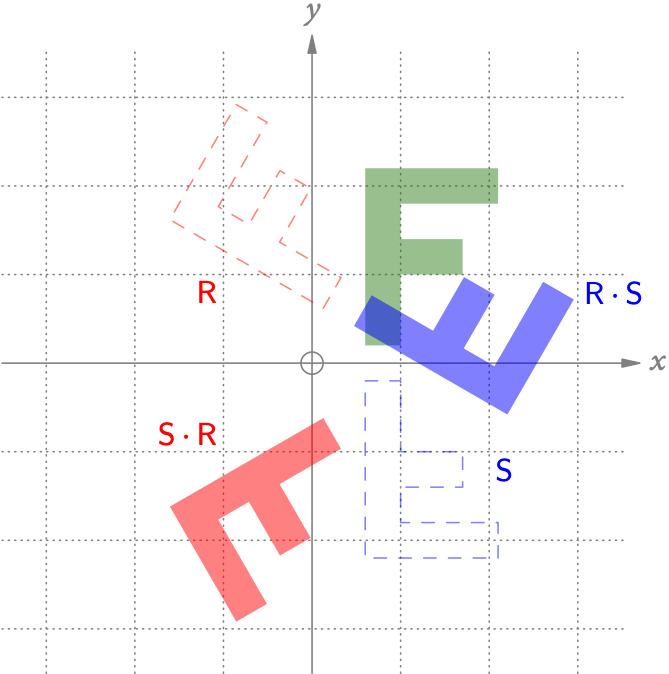 Eine schöne Eigenschaft der Multiplikation reeller/komplexer Zahlen gilt für die Matrizenmultiplikation leider nicht. In Abb. 9 erhalten wir das rote F, indem wir das grüne F zuerst 60° um den Ursprung drehen und dann an der x-Achse spiegeln. Spiegeln wir es jedoch zuerst an der x-Achse und drehen es dann 60° um den Ursprung, erhalten wir das blaue F. Offensichtlich sind das rote und das blaue F verschieden!