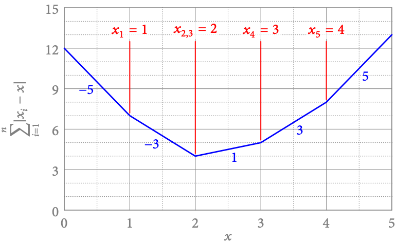 die von x abhängt und daher eine Funktion von x ist. Weil die Betragsfunktion stetig ist, ist auch unser f eine stetige Funktion auf ganz . Falls x viel kleiner als unsere Messwerte ist, sind die Abstände und daher die Summe sehr groß. Das gilt auch, falls x viel größer als die Messwerte ist. Aber für ein x irgendwo »mitten drin« in den Messwerten werden die Abstände und deren Summe eher klein sein. Für welches x wird diese Summe der Abstände also minimal?